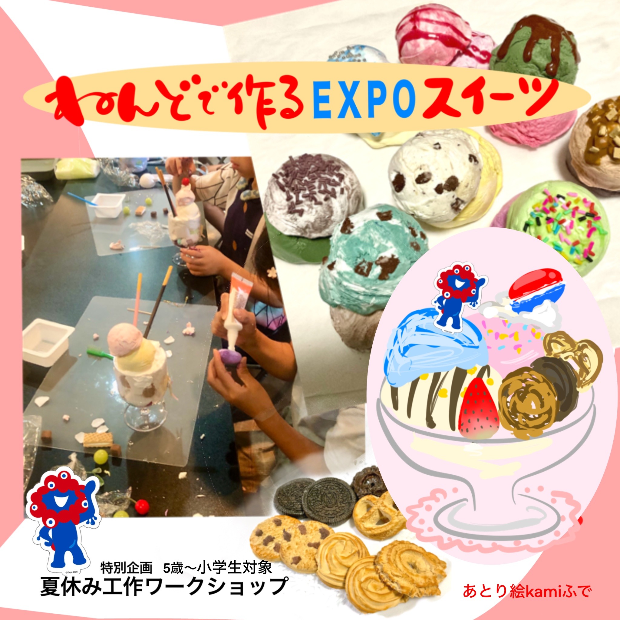 夏休みの工作ワークショップは、ミャクミャクパフェ作りです。